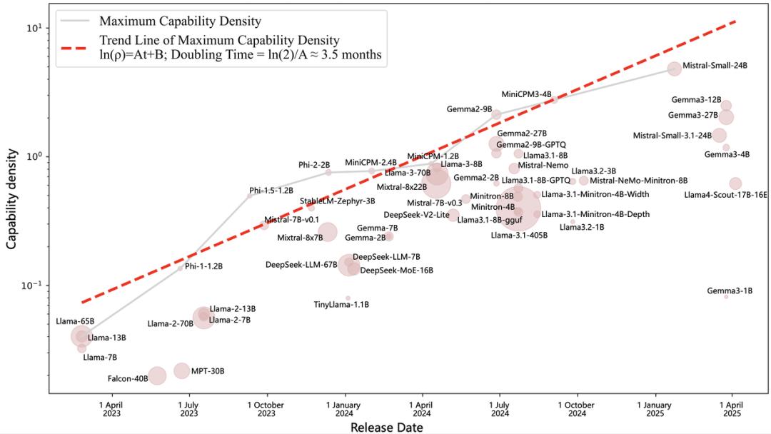 通过对 51 个近年来发布的开源大模型进行系统分析,研究团队发现了一个重要规律。大模型的最大能力密度随时间呈指数级增长,2023 年以来平均每 3.5 个月翻一倍。这意味着,随着「数据 - 算力 - 算法」的协同发展,可以用更少参数实现相同的智能水平。