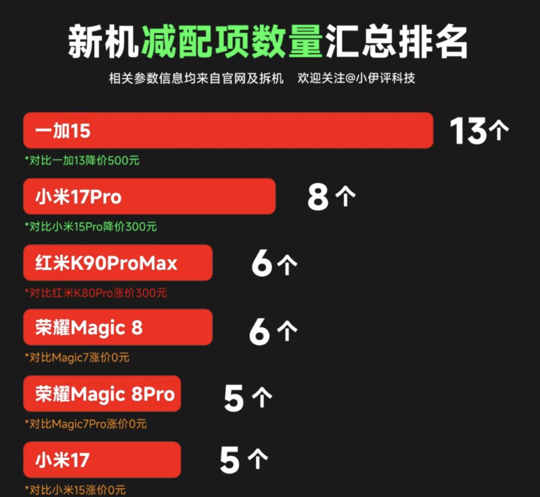 最可怕的,要数一加 15 系列:减配项数量足足达到了 13 个,成了今年的降配置之王;排名第二的小米 17 Pro和排第三的红米 K90 Pro Max,则分别有个 8 个和 6 个配置降配,要知道红米 K90 Pro Max 还是一款起售价涨了 300 块的机型。