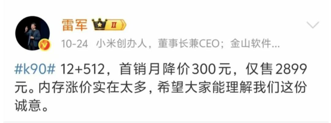 让我们把时间拨回 10 月 24 日,红米 K90 系列发布之日。雷军、卢伟冰两位高管在社交平台上大吐苦水,说 K90 系列涨价实属“无奈之举”,因为内存涨价实在太多,请大家多多包涵。