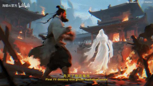 这部4分钟短片里,打斗动作占比约30%,在保证人物动作物理合理性的基础上,导演猫大人利用“海螺AI首尾帧”等技术实现人物之间的复杂交互,作品颇为流畅。