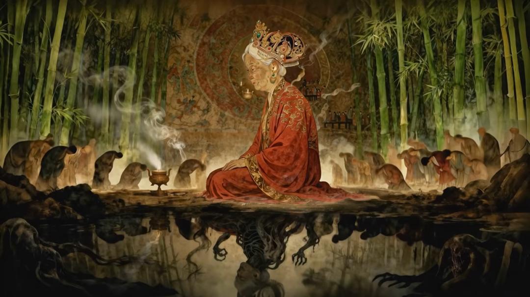 比如开头代表宗教崇拜的老妇,水中倒影细看都是张牙舞爪的骨架,暗示王室旧体系已经腐朽,为后续龙犬与三公主的反叛奠基。