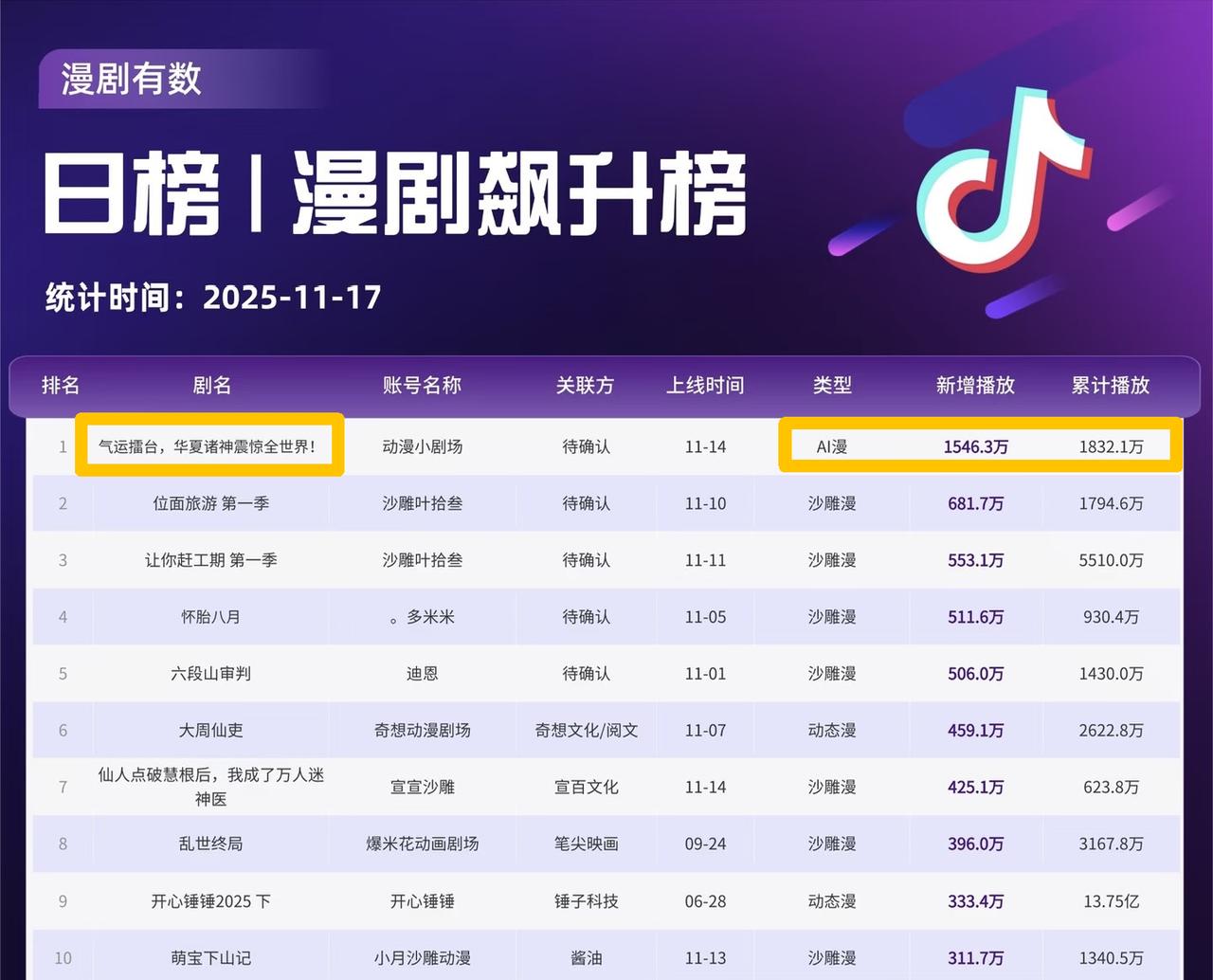 △ AI漫剧《气运擂台,华夏诸神震惊全世界!》登顶11.17漫剧飙升榜(cr.漫剧有数)