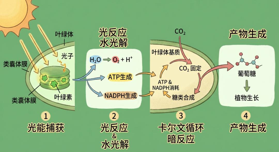再比如,生物老师要求“帮我生成一个介绍植物光合作用的流程步骤图,写明每一步的反应和参与的结构,插画风格。”