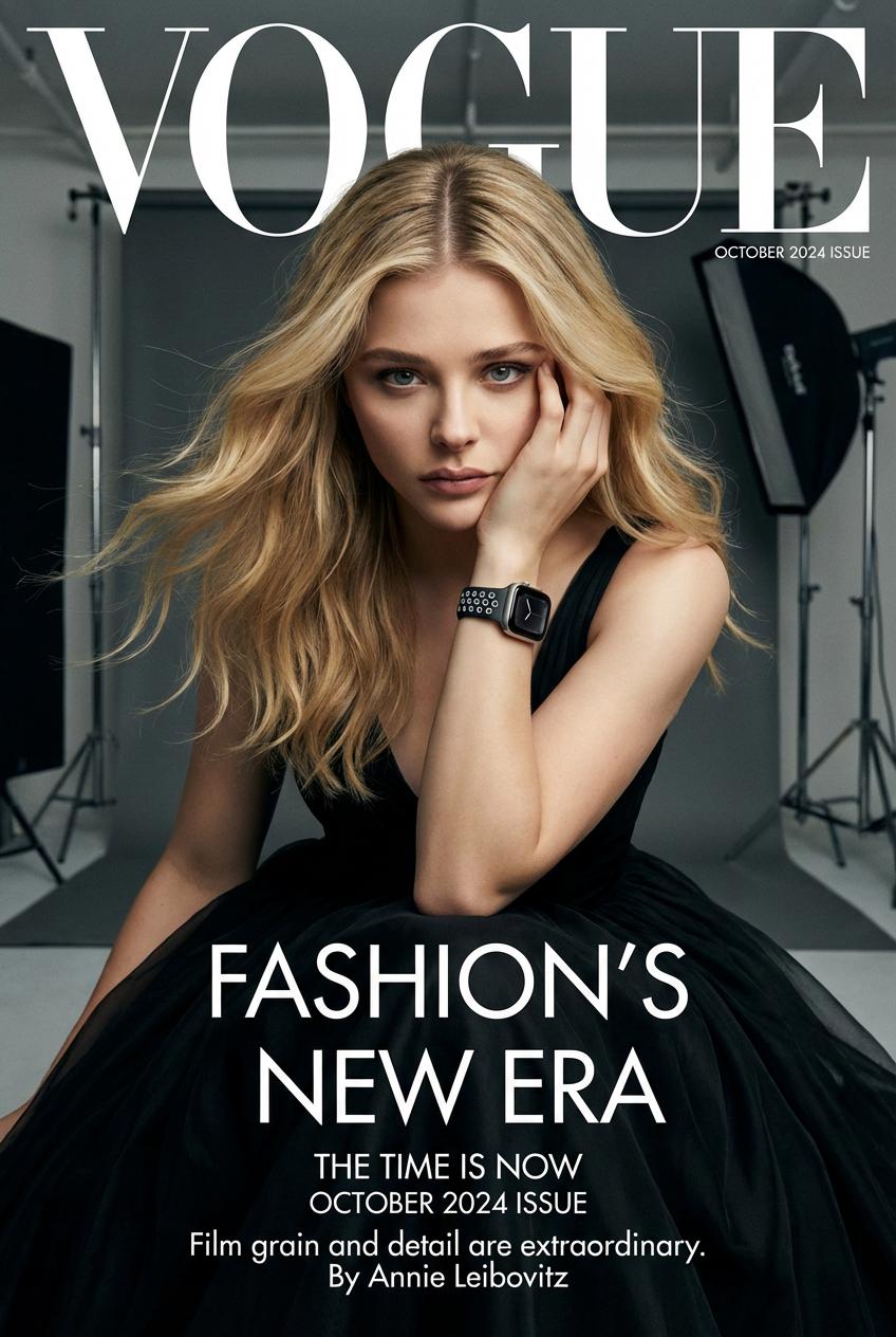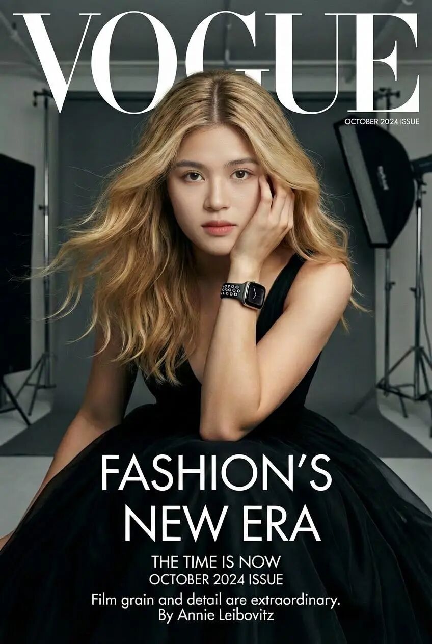 提示词:生成一张超写实、高清晰度的肖像画。画面内容是《VOGUE》杂志封面,包括杂志的标志和文字。封面有一位年轻女子,背景为摄影室内。她穿着一件华丽的黑色礼服,直视着观者,神情专注。她的右臂抬起,手部分触碰着她的脸侧,同时,右手手腕还有一块 Apple Watch。她的金色头发飘逸,中分造型。