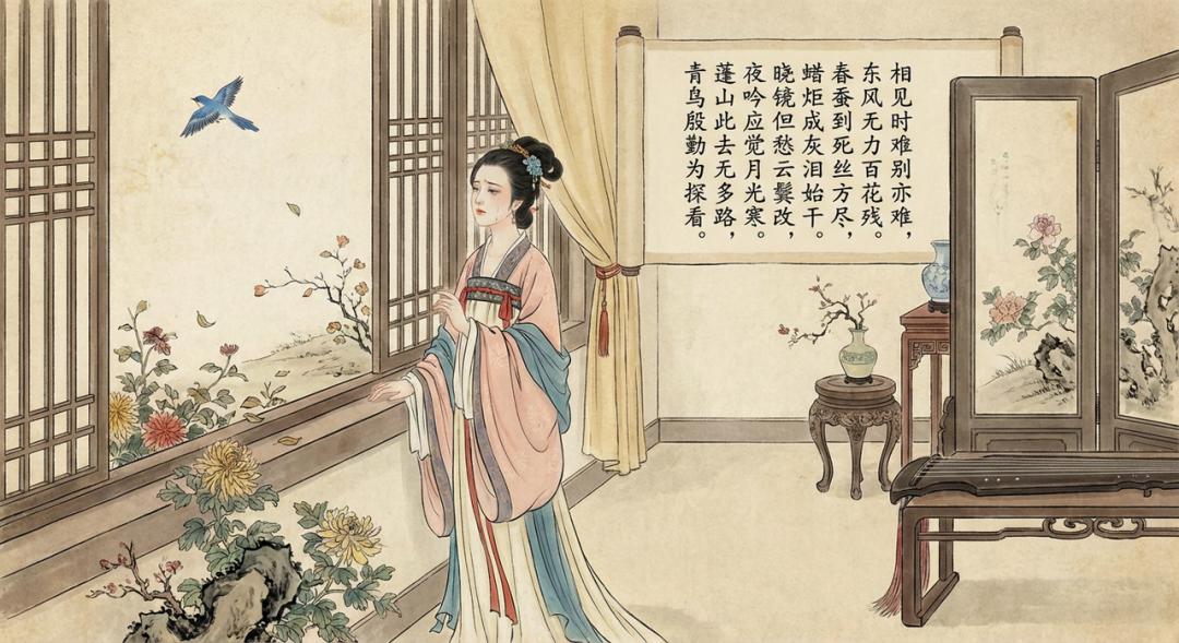 提示词:李商隐的《无题》是一首以男女离别为题材创作的七言爱情诗,请帮我生成一张中国风的插画,主题是一位女子在家中,站在窗边,窗外百花凋零,看着远处的青鸟流泪,并在画面合适的地方附上这首古诗。