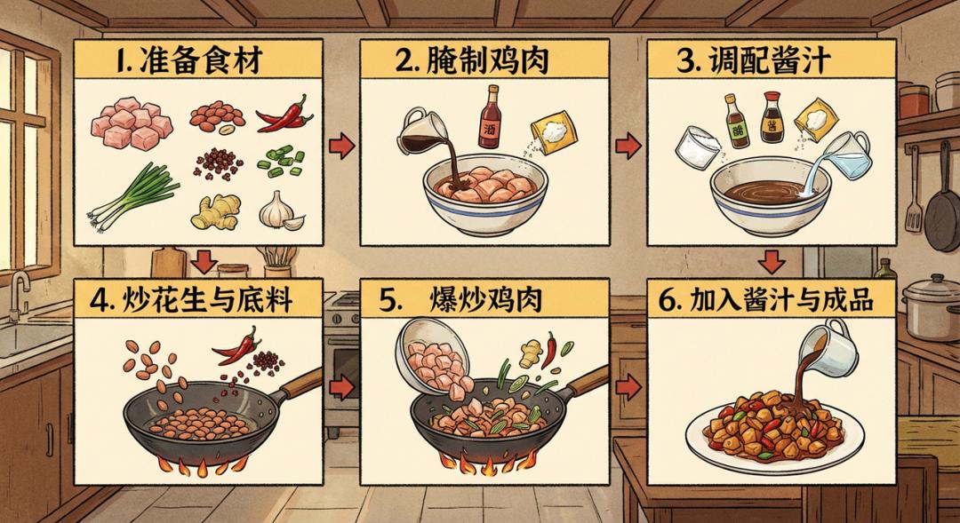 比如,帮我生成一个宫保鸡丁制作的流程步骤图,插画风格。