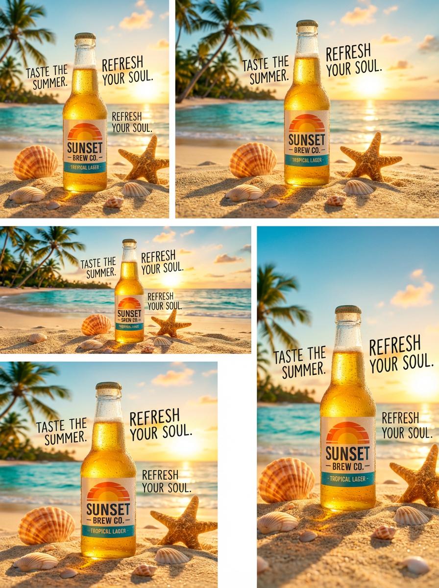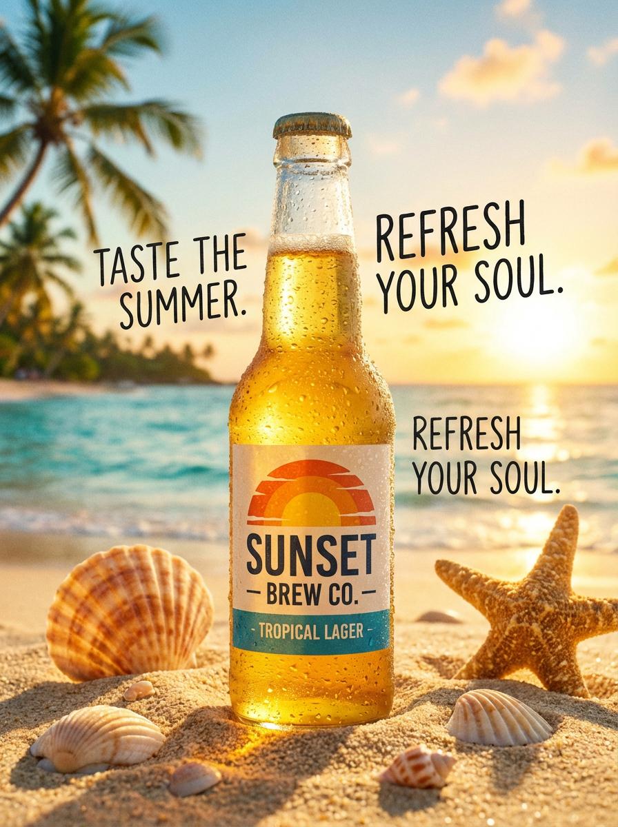 提示词:生成一个啤酒的海报宣传图。画面主体是阳光、沙滩,然后一瓶冰冻的玻璃瓶啤酒放在其中,瓶身上有许多小水珠。画面比例为 3:4,分辨率为 2K。