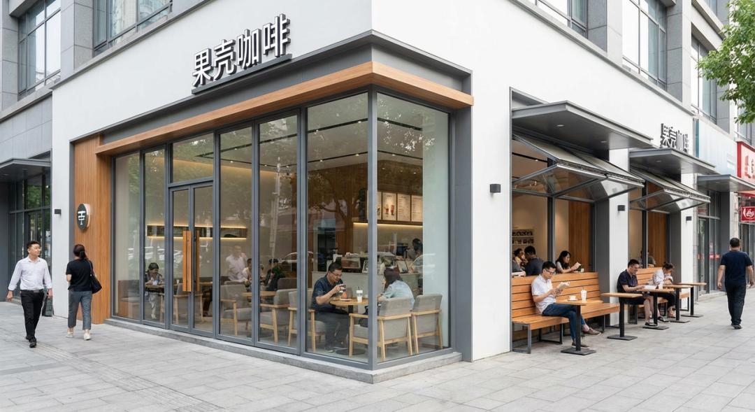提示词:生成一张咖啡店的照片,店名为果壳咖啡。咖啡店整体现代装修风格,坐落在城市转角,干净整洁。门店一侧是透明落地玻璃窗,另一侧是适合顾客落座的临街座位,有人在这里看书,也有人在店里喝咖啡聊天。