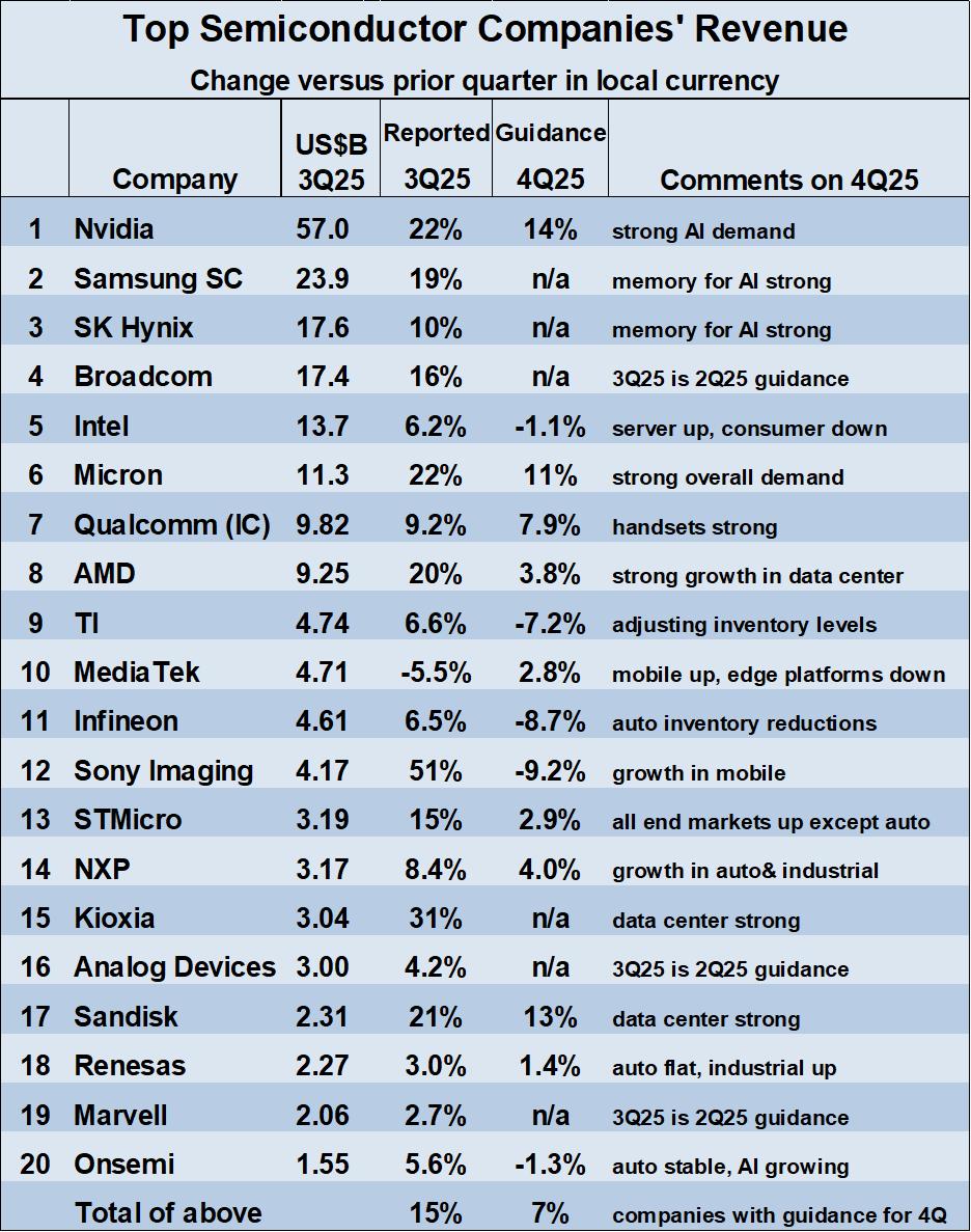 半导体公司对2025年第四季度营收变化的预期各不相同。在提供预期的14家公司中,9家预计营收将增长,增幅从英伟达的14%到瑞萨电子的1.4%不等。5家公司预计营收将下降,降幅从安森美半导体的-1.3%到索尼影像的-9.2%不等。