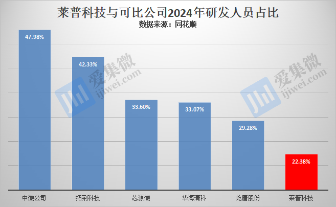 另外,报告期各期,莱普科技员工总数分别为127人、202人、277人、310人,对应的研发人数占比分别为20.47%、15.84%、22.38%、27.74%,与可比公司相比,其研发人员比重同样垫底。