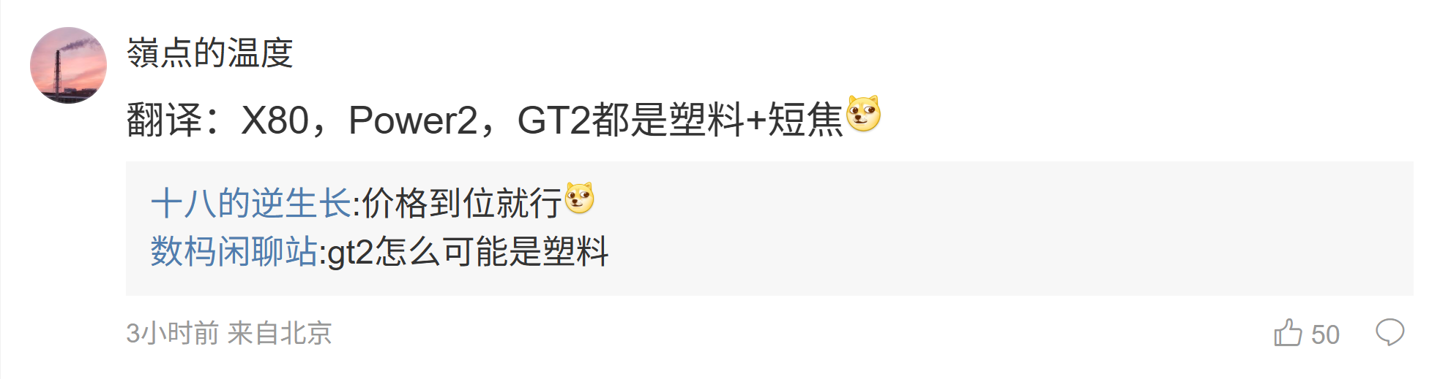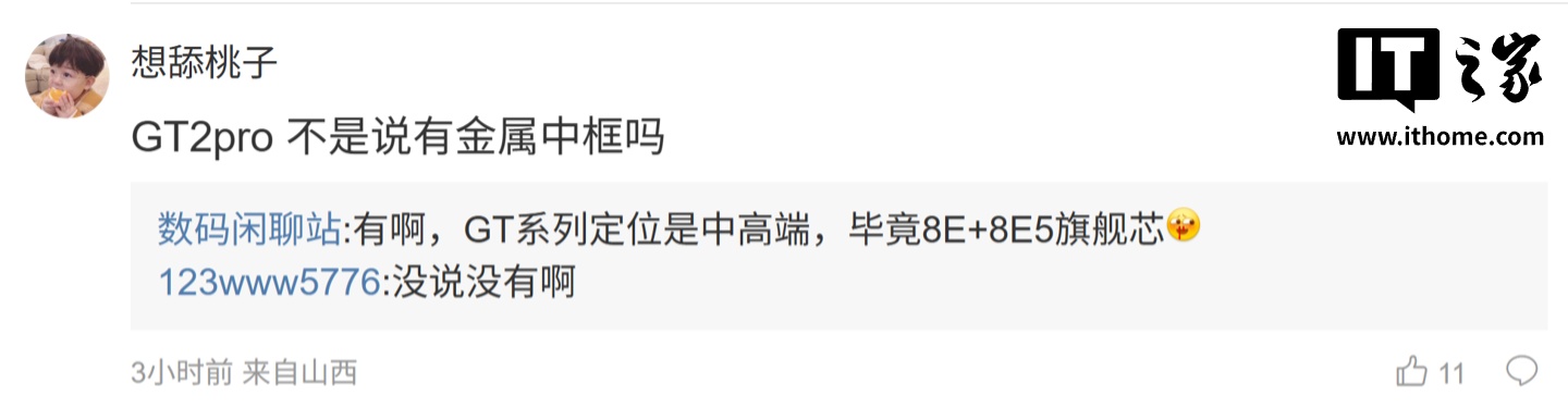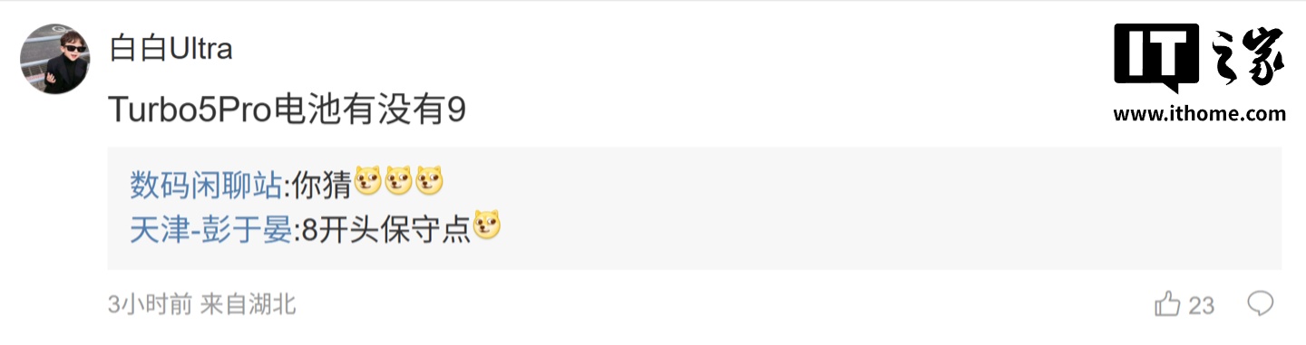 后续有用户在评论区询问:“Turbo5Pro 电池有没有 9”,博主回复道:“你猜”;另一名用户则询问道:“屏幕多大”,博主回复道:“常规大屏,6.7x-6.8x”;而另外一名网友则询问道:“GT2pro 不是说有金属中框吗”,博主则回复道:“有啊,GT 系列定位是中高端,毕竟 8E+8E5 旗舰芯”。
