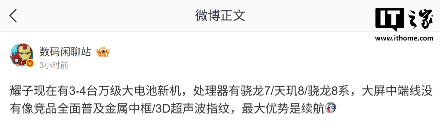 IT之家 11 月 21 日消息,博主 @数码闲聊站 今天在微博透露,某“耀子”厂内部现在有 3-4 台万级大电池新机。