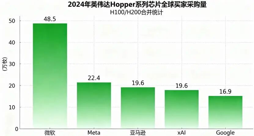 国际市场调研机构Omdia报告显示,2024年英伟达Hopper系列芯片全球最大买家包括微软、Meta、亚马逊、xAI、谷歌等,每一个科技巨头都在大规模囤积GPU,为AI竞赛储备“军火”。