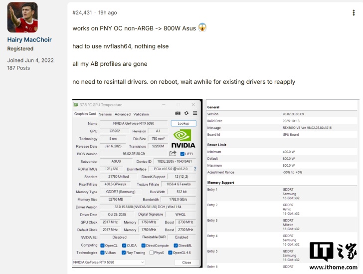 根据 Overclock 论坛用户测试,包括技嘉、微星、PNY 等厂商的多款 RTX 5090 型号已成功刷入该 BIOS,包括但不限于: