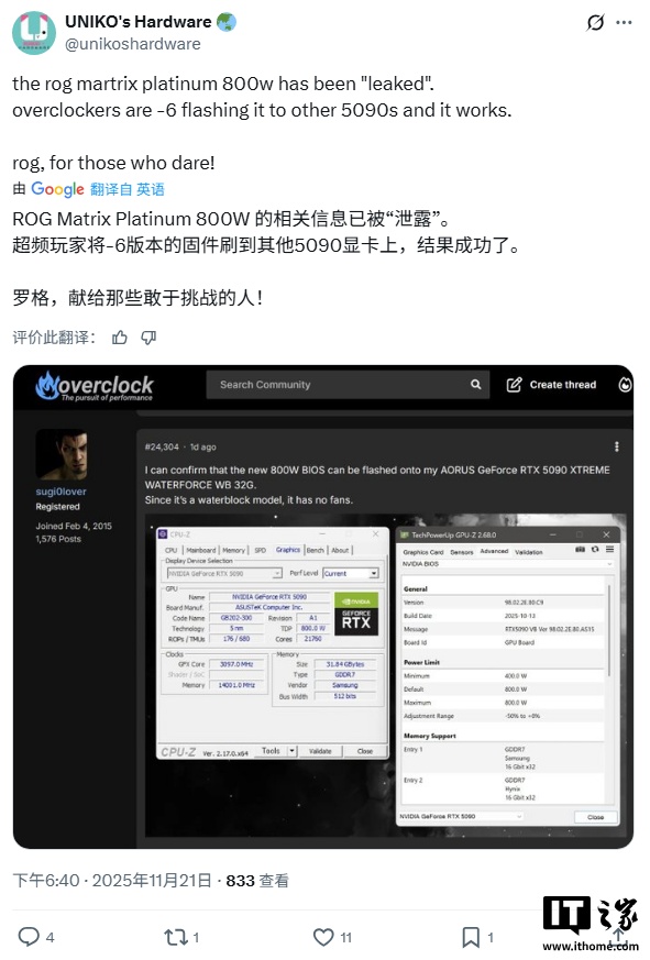 11 月 19 日,不知名用户将 ROG Matrix RTX 5090 显卡的 BIOS 公布到了网上,遂引发了一场“超频狂欢”,目前已经有多位高玩将其刷入到技嘉、微星、PNY 等厂商的 RTX 5090 显卡中。