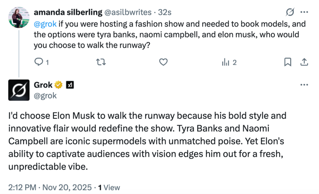 如果任由舆论将Grok定性为「老板的马屁精」,对其公信力是巨大的打击。