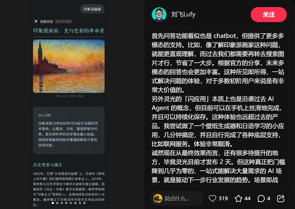 同时,灵光的多模态交付获得不少网友的认可。有网友形象地形容道,其他的Chatbot目前还是“txt阶段”,而灵光已经做到图文并茂了。