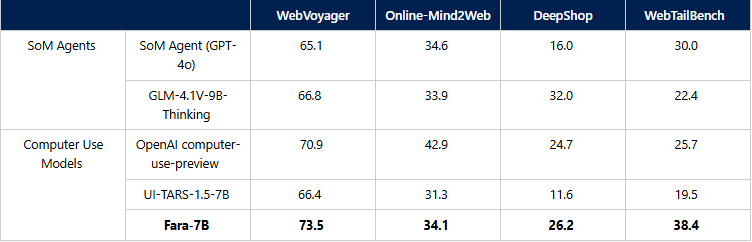 在测试中,Fara-7B 在多项公开基准(WebVoyager、Online-Mind2Web、Deepshop)以及微软新公布的 WebTailBench 中表现亮眼,在部分任务中领先同级模型 UI-TARS-1.5-7B,并可与更大规模、通过复杂提示方式驱动的系统(如使用 Set-Of-Marks 的 GPT-4o)竞争。