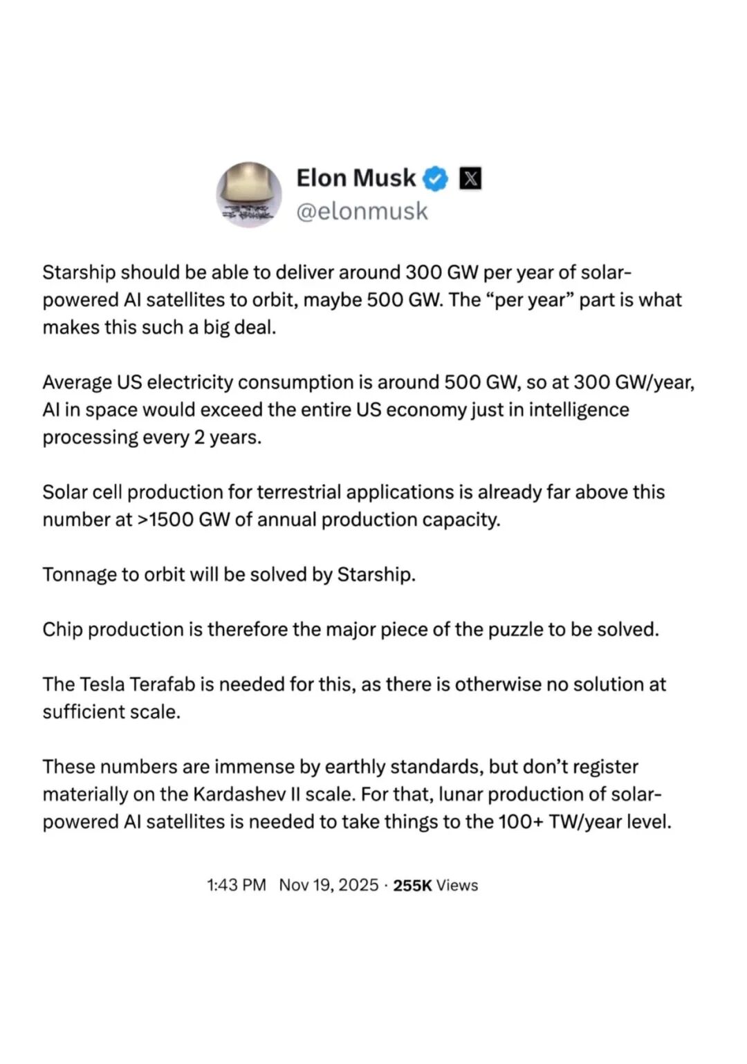 在美国沙特投资论坛之后的第二天,马斯克再次强调,这些AI卫星每年能产生100吉瓦的太阳能——相当于美国年平均用电量的四分之一。“我们已经把计划完全排出来了,会非常疯狂。”