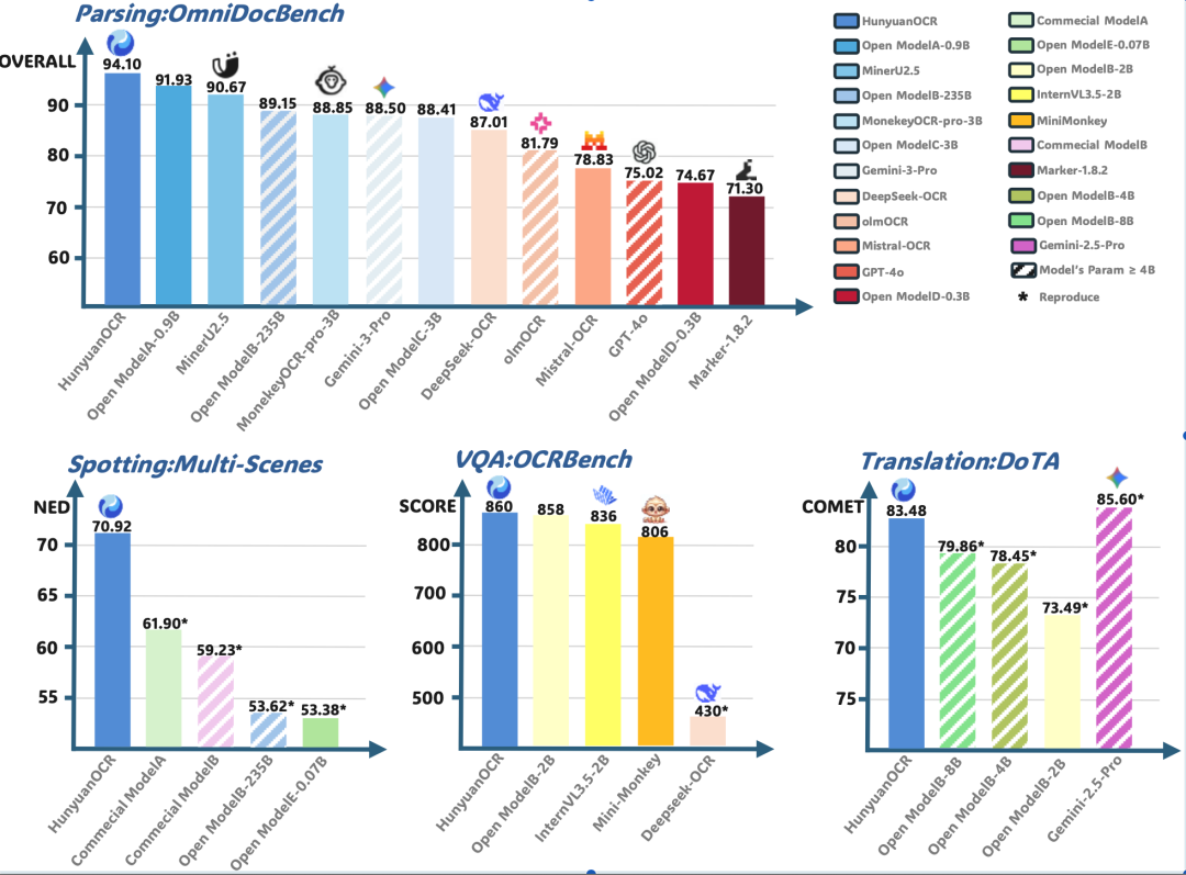 IT之家 11 月 25 日消息,腾讯混元今日宣布推出全新开源模型 HunyuanOCR,参数仅为 1B,依托于混元原生多模态架构打造,获得多项业界 OCR 应用榜单 SOTA(IT之家注:最先进水平)成绩。