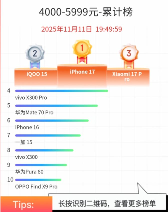 刚刚结束的双十一大促,来自京东竞速榜的数据显示,在4000-5999元累计榜上,一加15排名第七,而同样搭载第五代骁龙8至尊版芯片的iQOO 15排名第二,已经热卖一个月的小米17 Pro仍然保持了第三名的位次。