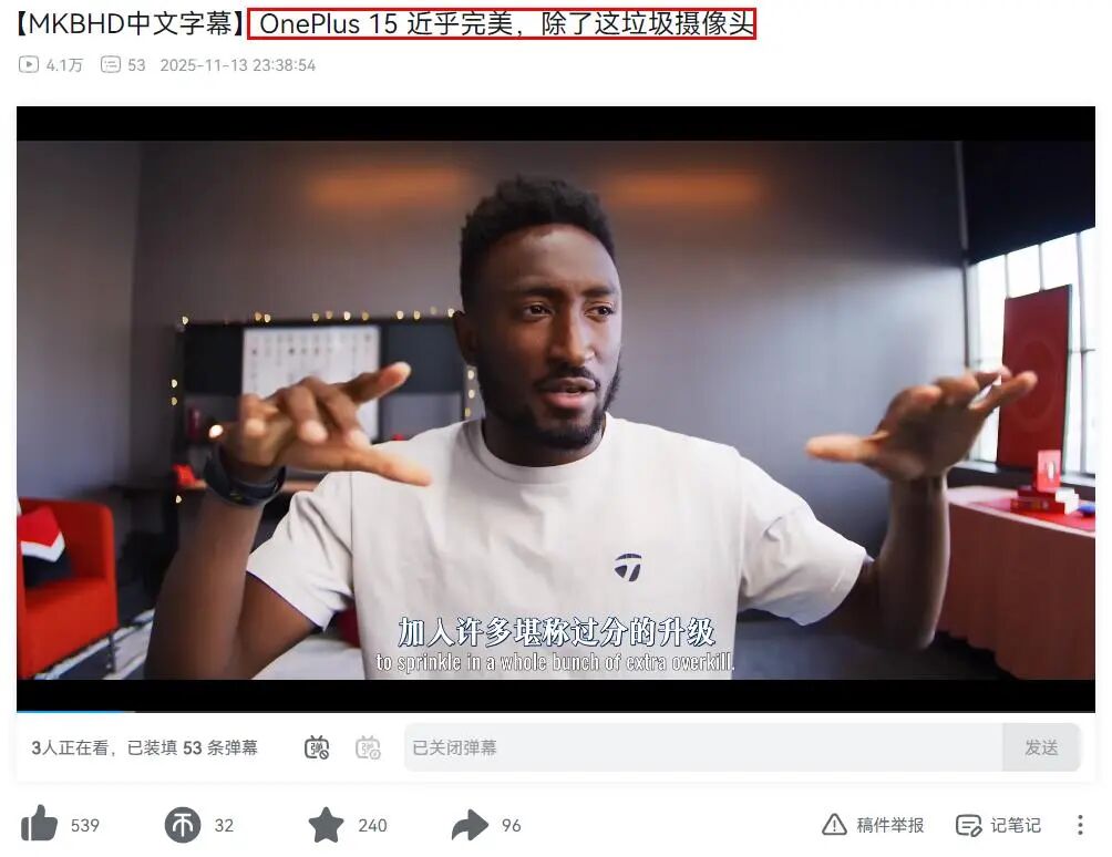 他们基本不接受厂商的“审稿”,比如,有着全球第一大科技数码评测UP美誉、来自YouTube频道的著名UP主“MKBHD”就直言“一加15近乎完美,除了这令人失望的摄像头”,他在视频中夸赞了一加15的诸多优点,但对一加15的相机表现表达了明显的不满。