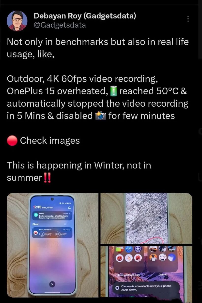 OnePlus15户外拍摄4K60fps视频5分钟即过热停止工作-Debayan Roy