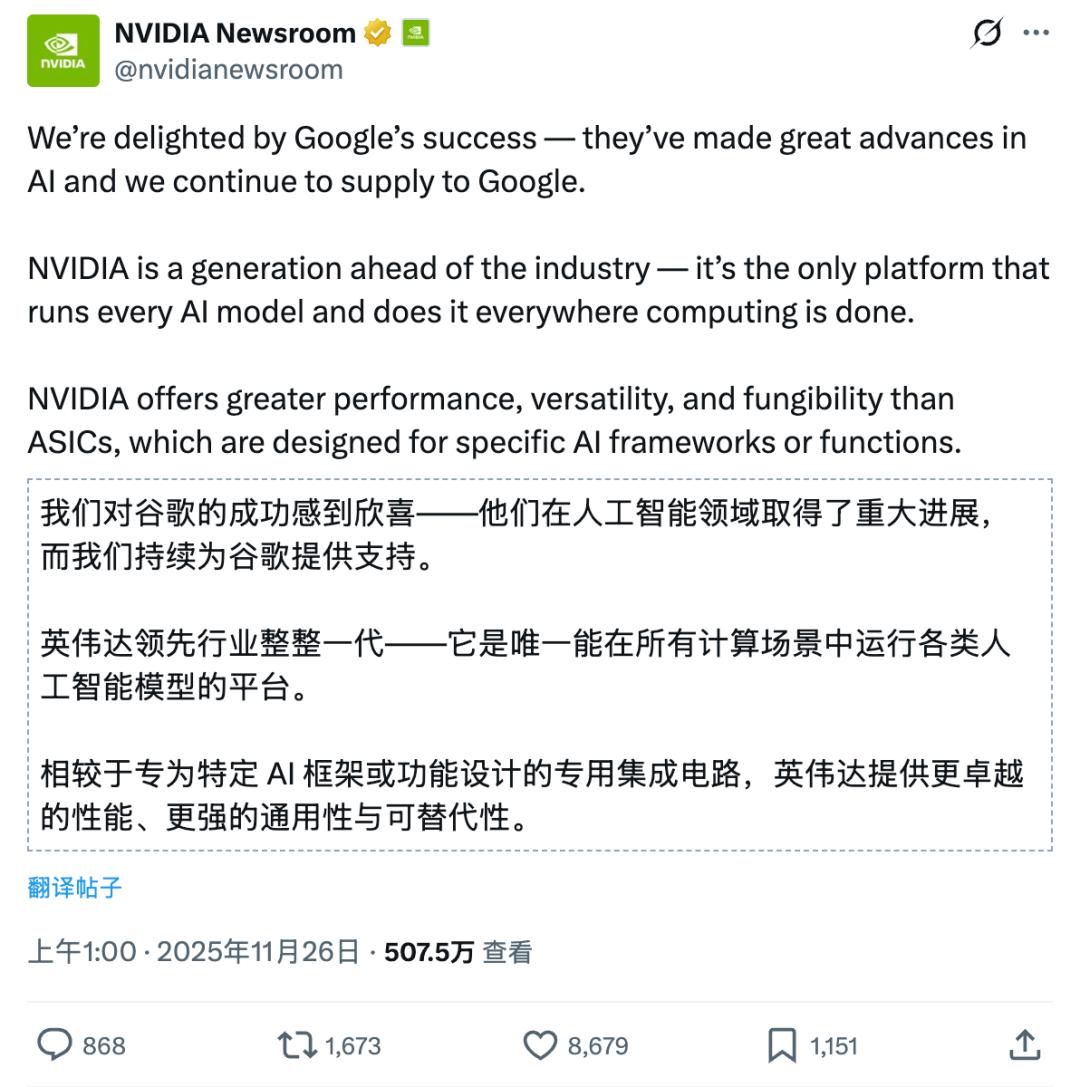 紧接着,英伟达股价应声下挫,逼得英伟达官方不得不亲自下场,在X平台上发长文辩护,强调CUDA生态的不可替代性。