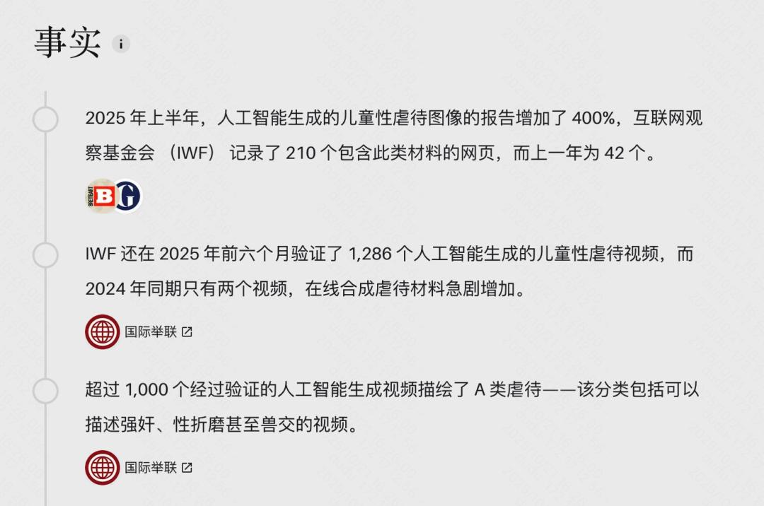 同月,《卫报》称人工智能生成的儿童色情制品数量已达到前所未有的水平。根据互联网观察基金会(IWF)的最新调查结果,人工智能制作的儿童性虐待视频激增 400%,仅2025年上半年就验证了1286个视频,而去年同期仅有2个,在线合成虐待材料急剧增加。