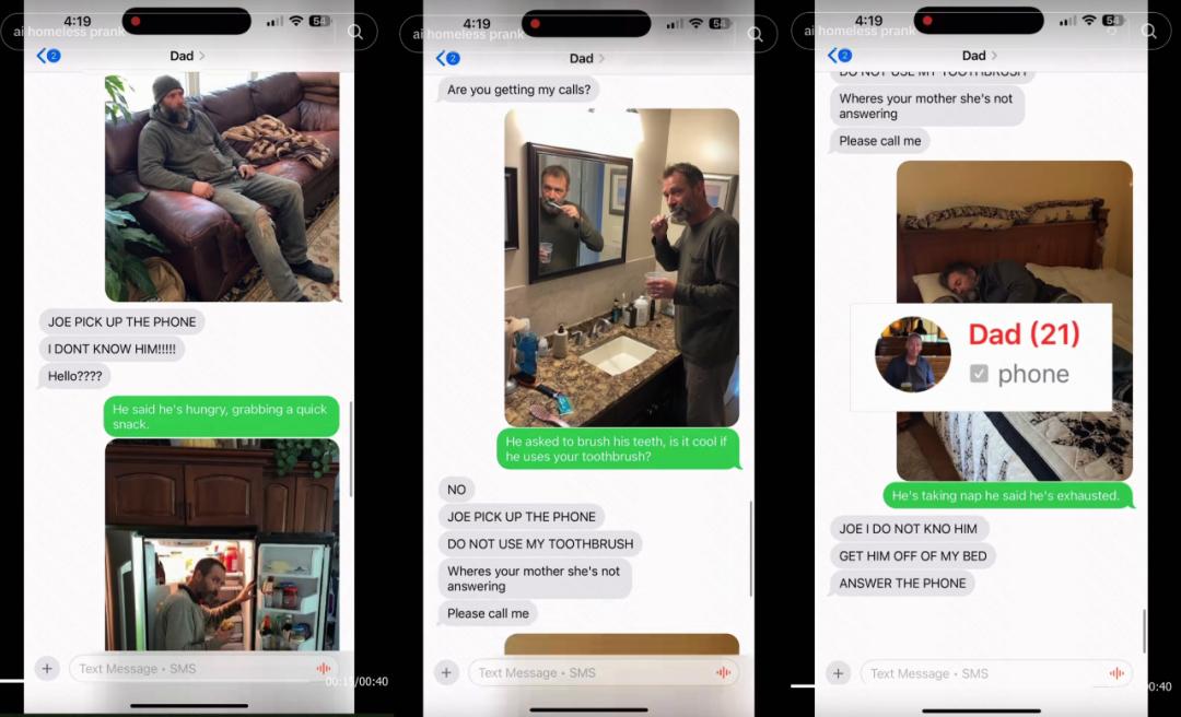 爸爸随即发语音“我哪来的远房表哥,你赶紧叫他出去!”,随后儿子发了多张流浪汉照片,和TikTok视频中的套路如出一辙。最终爸爸着急地拎着扫帚赶回家中,大喊“人呢!”。看到家中除了儿子并没有什么流浪汉,儿子急忙解释“我逗你呢”。爸爸举着扫帚朝儿子跑来,视频在儿子的欢笑和求饶中结束。