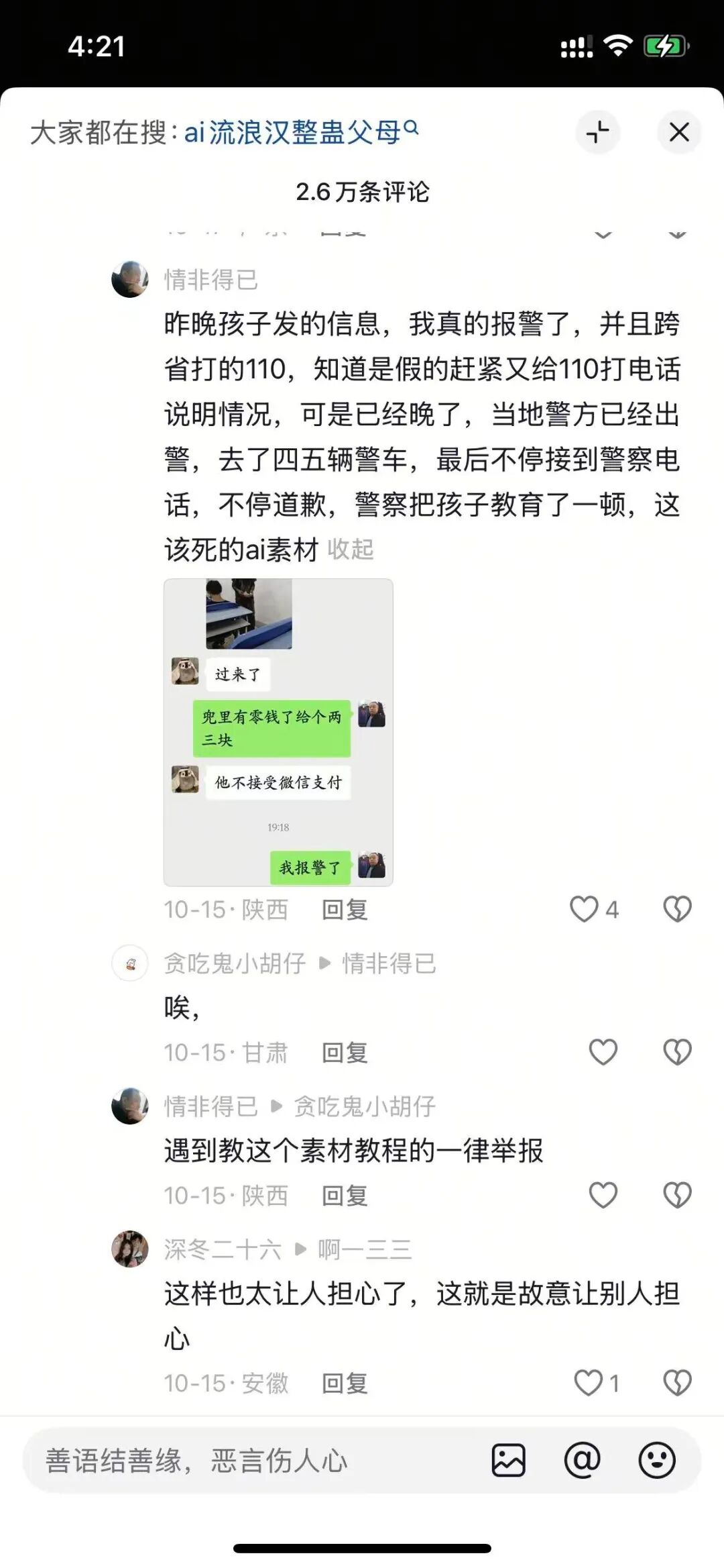 有人贴出截图,说“昨晚看到孩子发的消息,我真的报警了,并且跨省打的110,知道是假的赶紧又给 110打电话说明情况,可是已经晚了,当地警方已经出警,去了四五辆警车,最后不停接到警察电话,不停道歉,警察把孩子教育了一顿,这该死的ai素材”