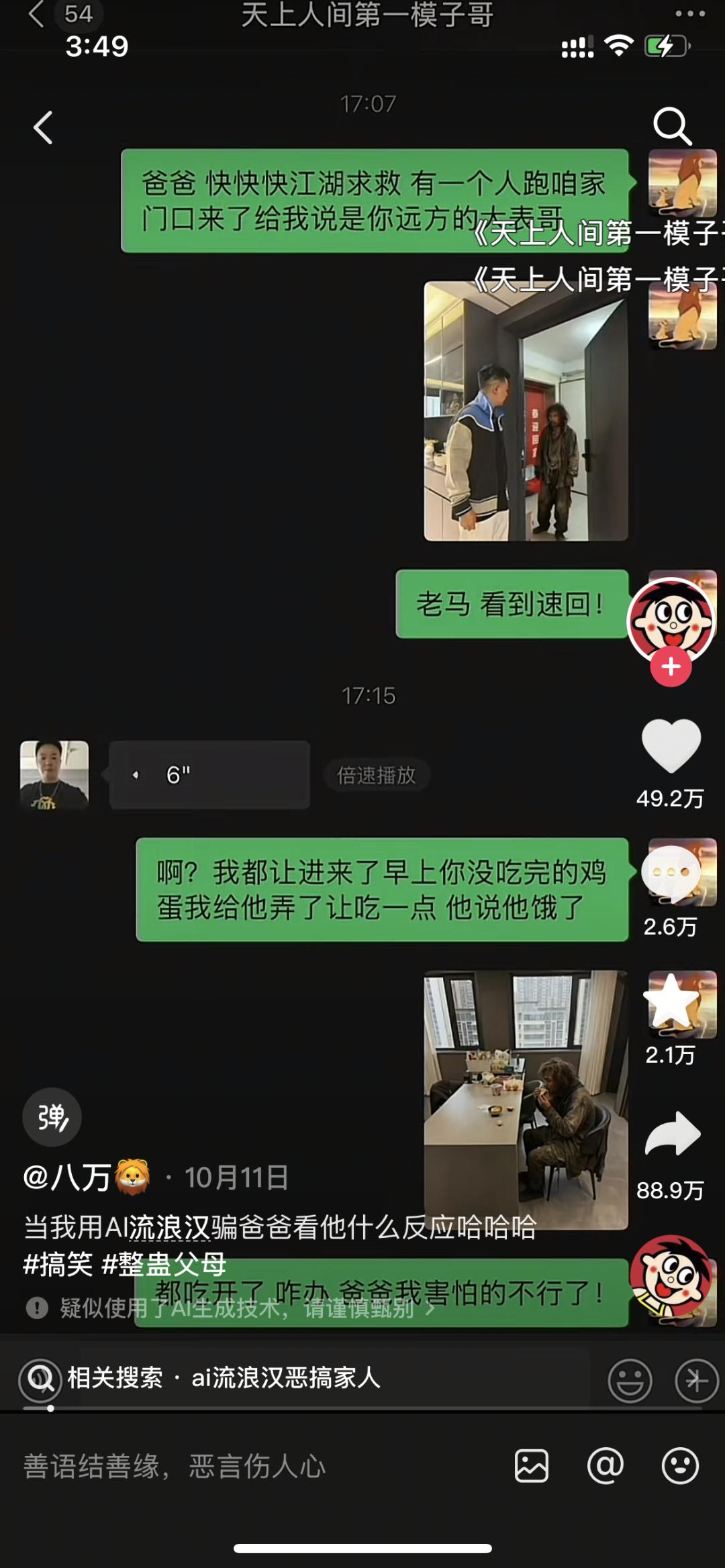 一条名为“当我用AI流浪汉骗爸爸看他是什么反应”#整蛊父母”的模仿视频点赞量超过40万。视频中同样是一段父子聊天记录的录屏,28岁的儿子给爸爸发微信说“有个人跑咱家门口来了,说是你远方大表哥”,然后发了一张流浪汉站在家门口的照片。