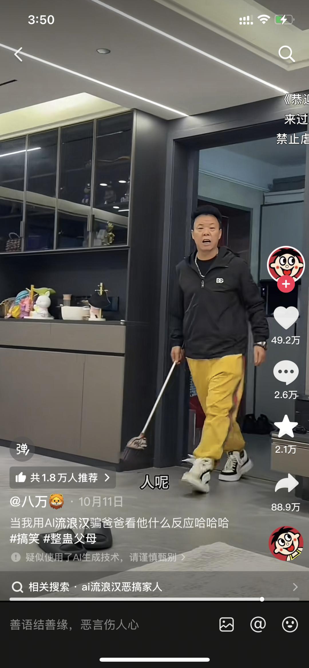 抖音上搜索“AI流浪汉”可以看到使用豆包等AI工具制作的大量恶搞视频,“关于我无聊,用AI做了个流浪汉整蛊我爸妈/爷奶/室友...”已然变成了流量密码。