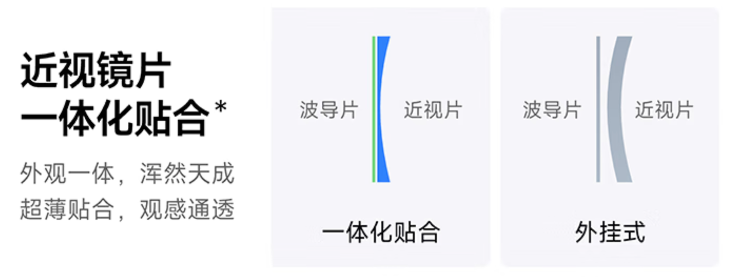 同级别竞品大部分采用的是磁吸片或夹片方式,简单来说就是在光波导镜片上,再额外夹上一片近视远视镜片,相当于镜片 + 镜片,体验只能说“凑合”了,对于近视人群也相当不友好。