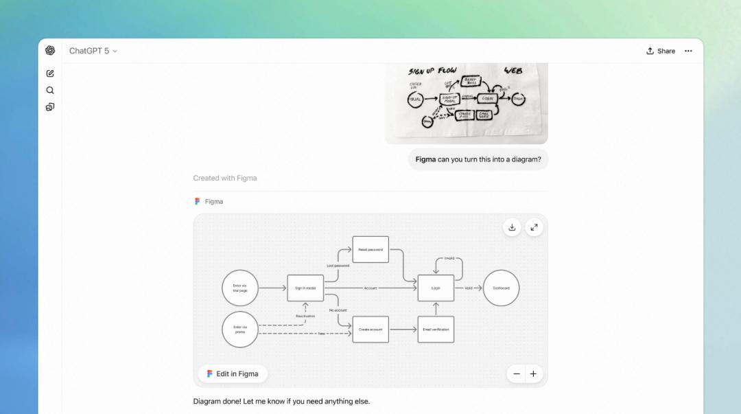 首先,能不能请你简单介绍一下Figma目前在做的事情?Dylan Field:Figma是一个从“想法到应用”的完整平台,让用户在创意到落地的过程中拥有无缝体验。我们旗下的FigJam,主要是用来做创意构思、头脑风暴、团队协作和绘制图表。图表功能是我们近来非常关注的一部分,因为它几乎是所有团队规划、决策和思考的基础环节。最近你们宣布和OpenAI合作,把FigJam集成到ChatGPT里。为什么要这样做?Dylan Field:我自己在使用ChatGPT时注意到一个问题:它其实能很好地理解图表,但不擅长“画出来”。有时候它会生成Mermaid代码(一种通过简单文本语法生成图表和流程图的工具)或一些抽象内容,但没有一个地方能直接把这些代码可视化。所以当我们和OpenAI谈到合作时,就特别兴奋——我们希望让用户能把ChatGPT生成的Mermaid图表直接导入FigJam,并在里面编辑和展示。那为什么不直接在FigJam里完成所有操作?Dylan Field:我们其实不认为这是“二选一”的问题。有时候你确切知道自己想画什么,就直接在FigJam里动手;但有时候你会先在ChatGPT里建立上下文、反复提示生成图表,然后再导入Figma平台中保存、分享、微调。两者结合起来,能让创作更顺畅。