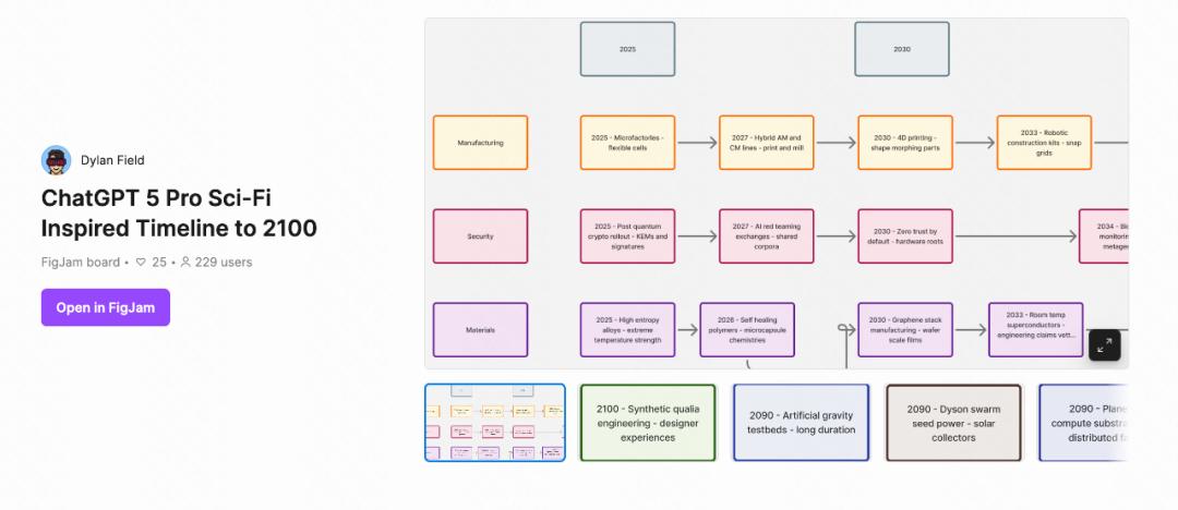 能具体说说“视觉表达”吗?Dylan Field:现在设计素养和视觉沟通变得比以往任何时候都重要。如果你不能在工作中用图像表达想法,就会处于劣势。我们想让更多人能轻松地通过视觉表达自己的思考——更快地生成图表、不断修改优化,最终形成自己的表达方式。在和OpenAI的合作中,你有没有担心用户花更多时间在ChatGPT里,而不是在FigJam上?Dylan Field:其实没有。举个例子吧。去年跨年夜我做了一个“通往2100年的科技树”演讲。第一次我用GPT-4 Pro做,结果前后花了近24小时——2/3的时间在生成内容,1/3的时间在FigJam里手动排版。而昨晚我用新的集成功能重新试了一次,总共只用了半小时。这就是更强的模型、更顺畅的工具结合后能带来的变化:更快、更大、更自由地探索。