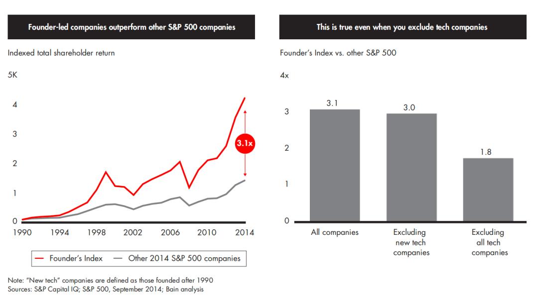 全球咨询公司贝恩在2016年发布的一份研究报告《BARRIERS AND PATHWAYS TO SUSTAINABLE GROWTH:Harnessing the power of the Founder’s Mentality》显示,创始人领导的公司,要比其他人(职业经理人)率领的公司更加优秀。