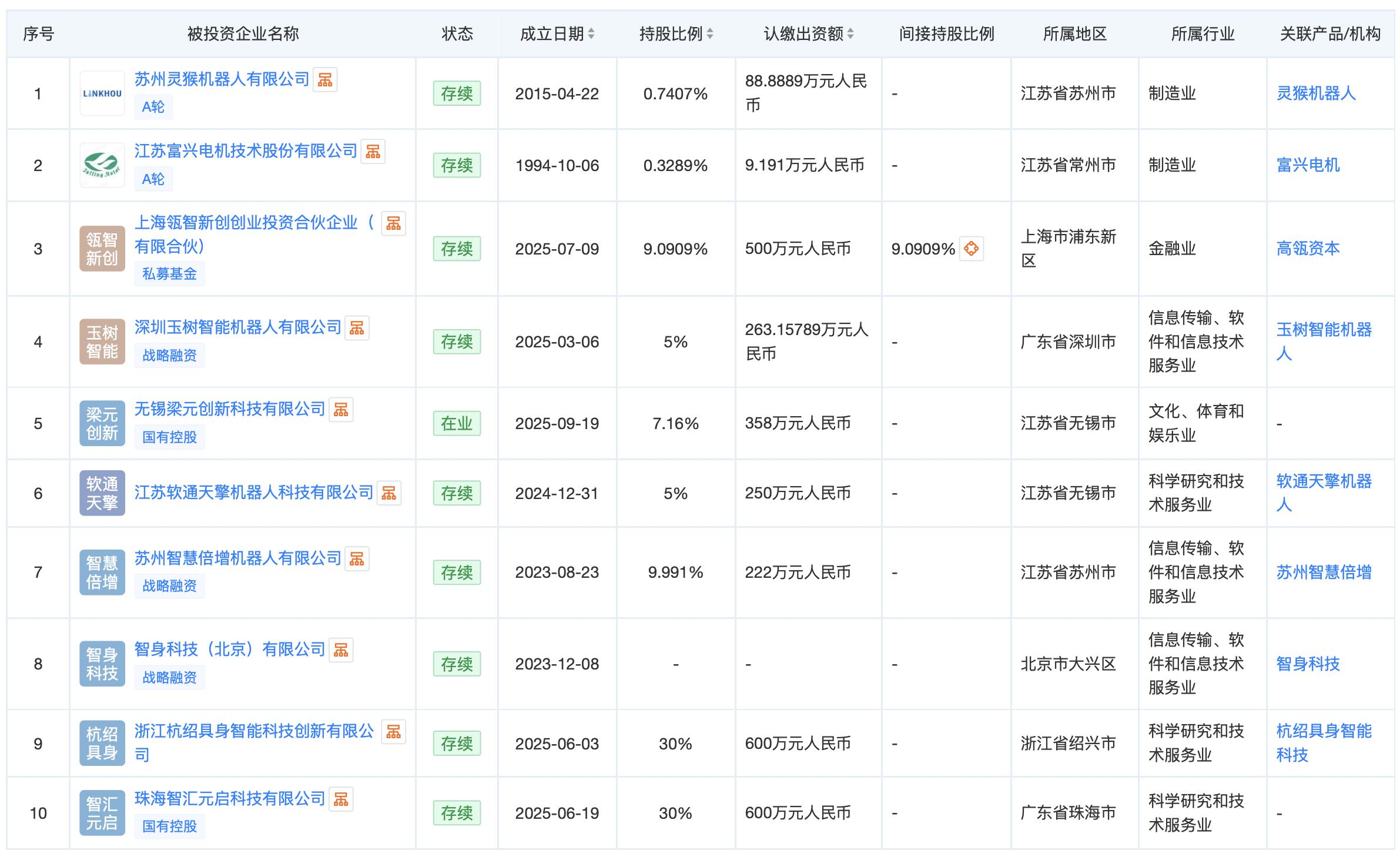加快开发机器人相关产品的同时,该公司在资本运作和产业布局上动作频繁。成立至今,其已投资或与外部各类产业方、机构等合资设立众多公司,业务方向广泛,涵盖具身智能领域的本体及大模型、关键零部件等。