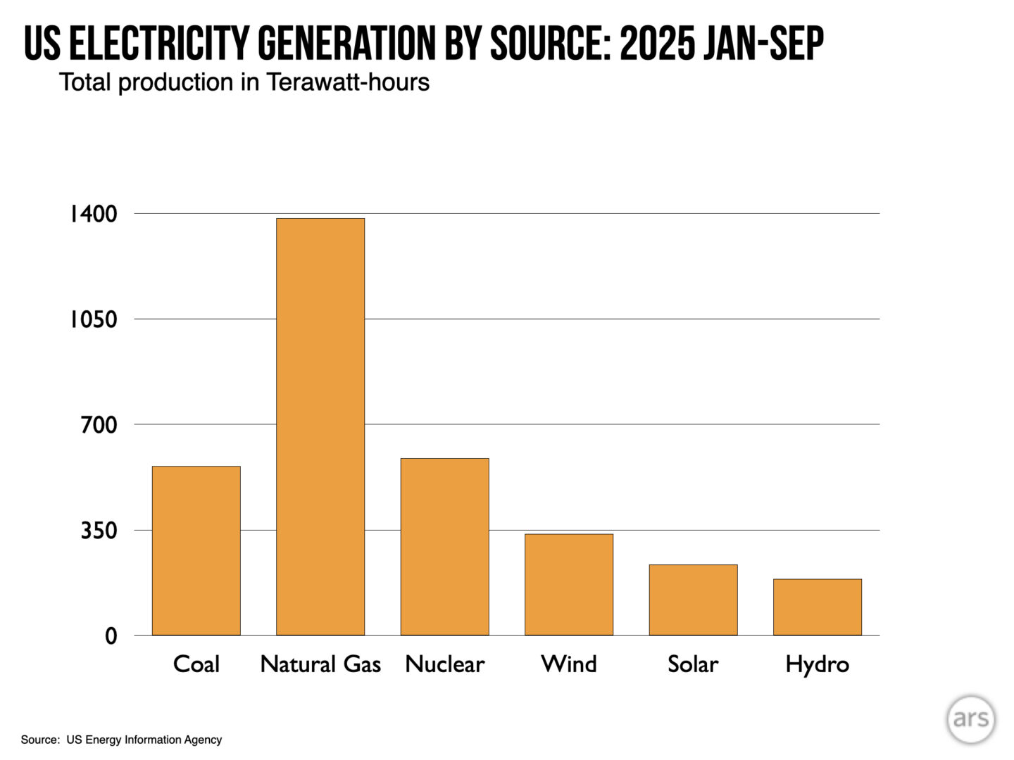 2025 年除太阳能和煤炭外,美国大多数能源供应基本保持不变。