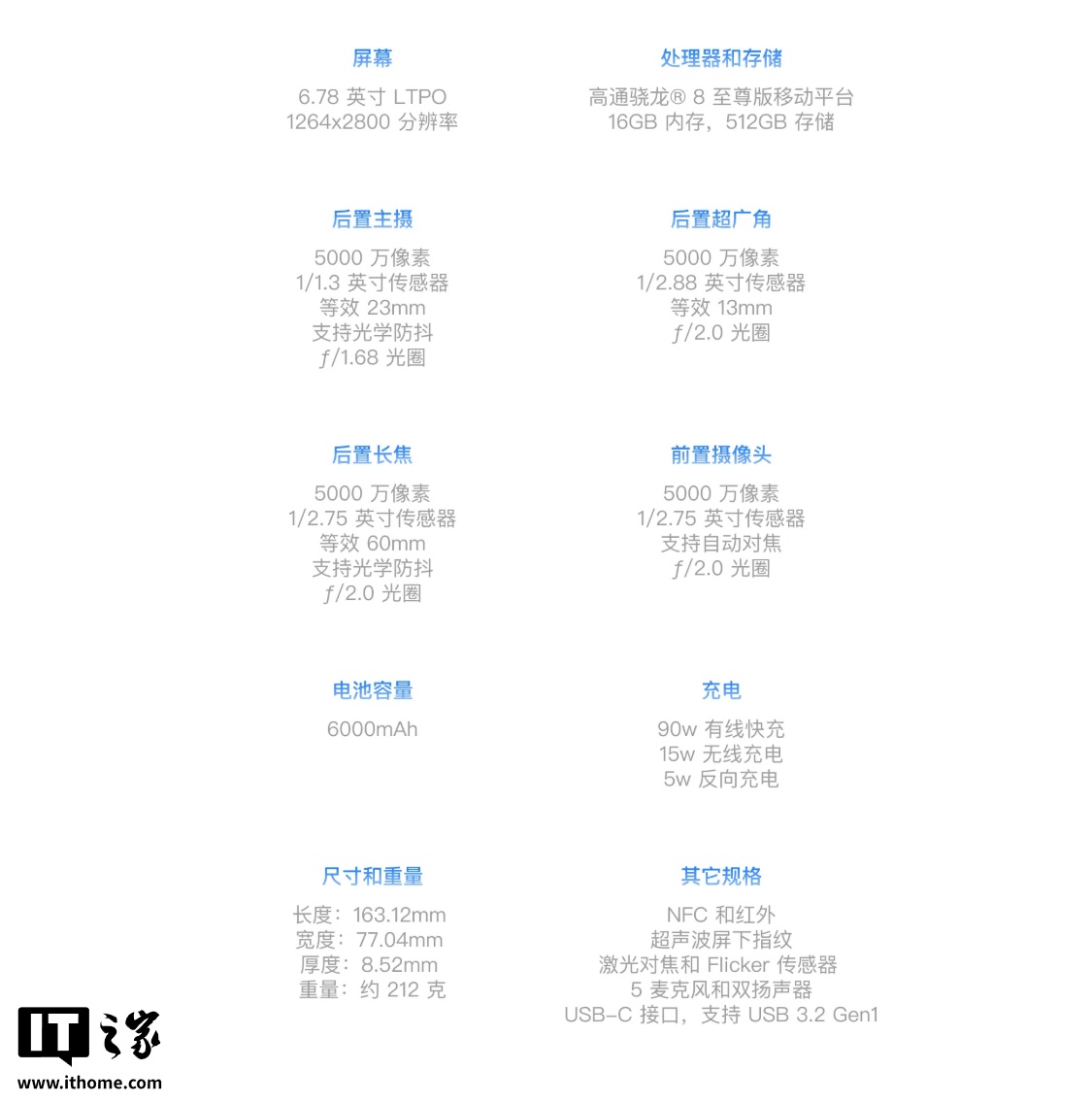 此外,这台手机还支持 90W 有线快充、15W 无线充电,重量 212 克,长宽厚分别是 163.12*77.04*8.52mm,支持 NFC 和红外遥控,配备激光对焦和 FLicker 传感器,拥有 5 麦克风和双扬声器,USB-C 接口支持 3.2 Gen 1 传输速率。