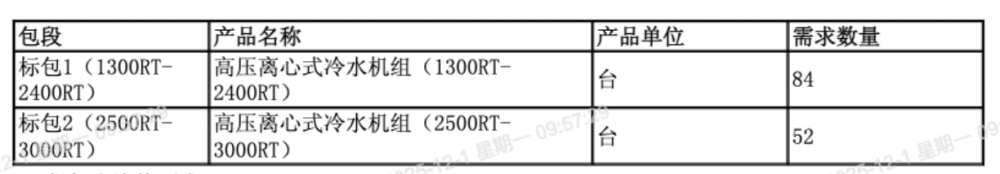 该项目采用混合招标:划分为两个标包,标包1冷量为1300RT-2400RT;标包2冷量为2500RT-3000RT。