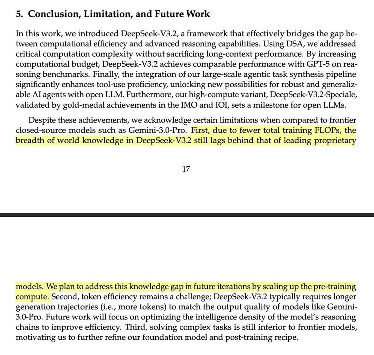 有网友评论说,每篇DeepSeek论文最重要的部分永远是“结论、局限性与未来工作”部分。这次的技术报告也不例外,他们说:“首先,由于总训练FLOPs较少,DeepSeek-V3.2 的世界知识广度仍落后于领先的闭源模型。我们计划在后续版本中,通过扩大预训练算力来弥补这一知识差距。”