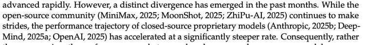 技术报告Introduction部分有句话值得注意,“过去几个月,开源社区虽然在持续进步,但闭源模型的性能轨迹正在以更陡峭的速度加速。差距不是在收窄,而是在扩大。”同时点出了当前开源模型的三个核心短板: