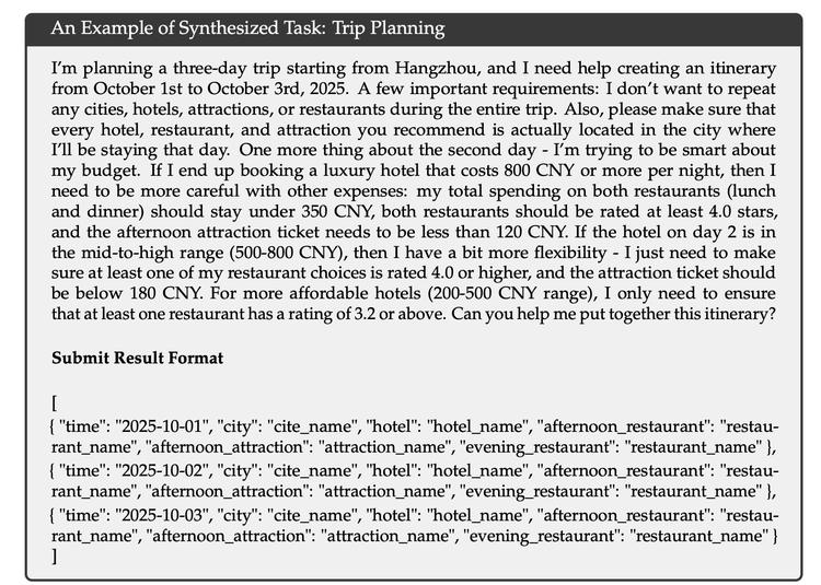 这套流水线的核心设计哲学是“难解答,易验证”。以报告中的旅行规划任务为例:复杂约束组合让搜索空间巨大,但验证方案是否满足约束却很简单。这种特性天然适合强化学习,模型可以通过大量尝试获得明确的对错反馈,不需要人工标注。