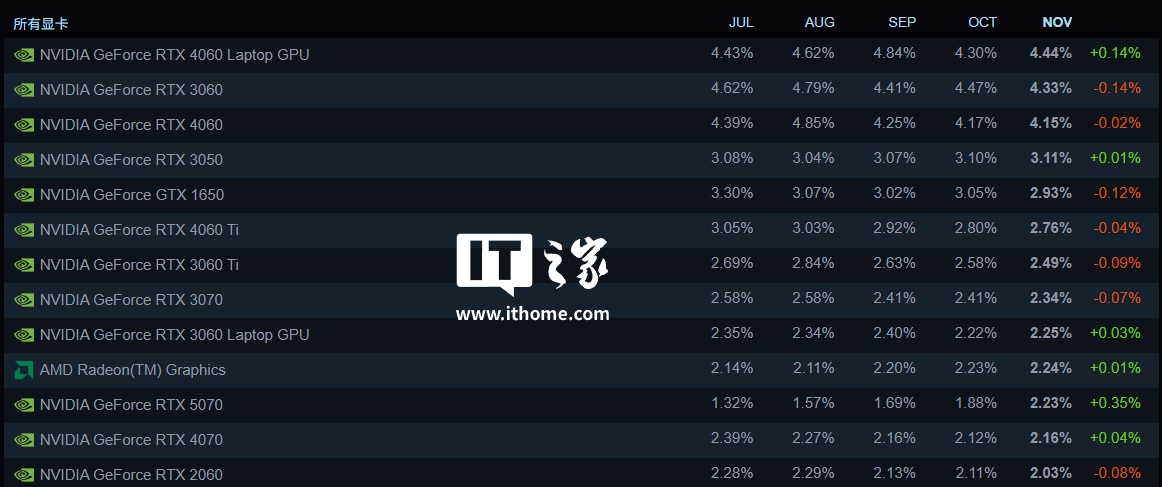 IT之家 12 月 2 日消息,V社昨日发布了 2025 年 11 月的 Steam 硬件与软件调查报告。其中,英伟达 RTX 50 系列显卡强势崛起,RTX 5070 成功超越了前代 RTX 4070,首次进入 Steam 独立显卡份额排行榜前十名。
