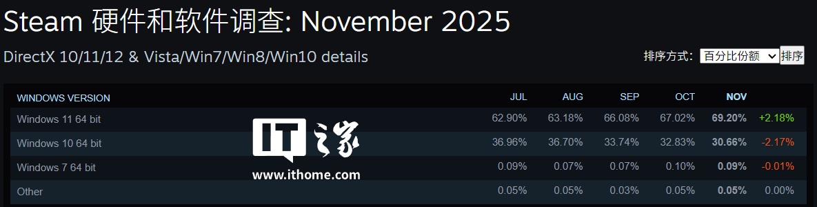 IT之家注意到,在 Windows 系统方面,11 月 Steam 平台的 Windows 11 占比继续攀升 2.18%,份额提升到了 69.2%;Windows 10 则下滑了 2.17%,份额为 30.66%。