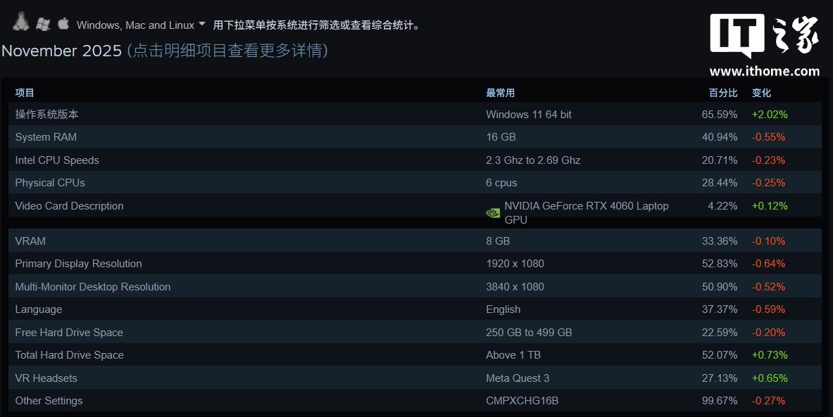 以下是 2025 年 11 月 Steam 平台的综合统计信息,数据代表目前最常用的软硬件: