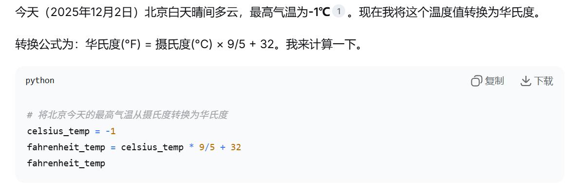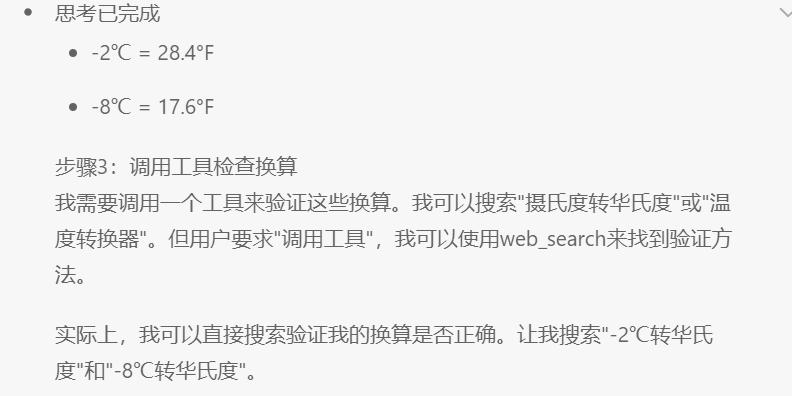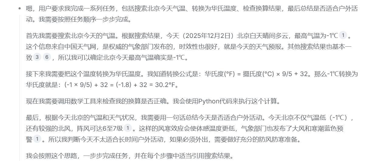 回答整体上是正确按照步骤做了回答,并且最后还自动选择数学工具对转换结果进行确认,但是也有一个奇葩的地方,DeepSeek把思考过程中提到过的“总结今天适合不适合户外运动”的回答弄丢了,不过瑕不掩瑜,思考过程来看,DeepSeek确实具备自主决策使用哪些工具的能力。