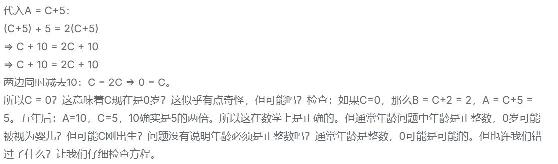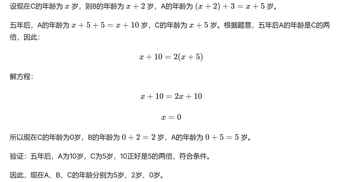问:A 比 B 大三岁,B 比 C 大两岁。五年后 A 的年龄刚好是 C 的两倍。问现在三个人多少岁?