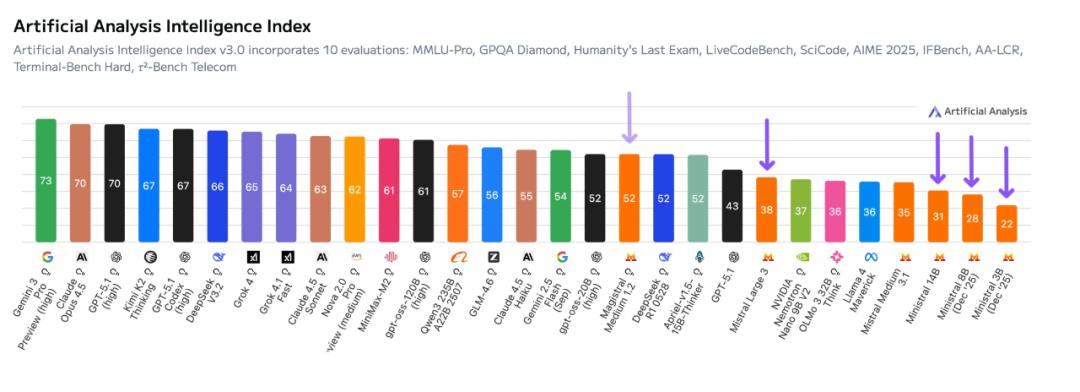 Ministral 3的instruct版本在综合智能指数上的得分分别是31(14B)/ 28(8B)/ 22(3B)──全部跑赢上一代Mistral Small 3.2,参数量甚至多40%。